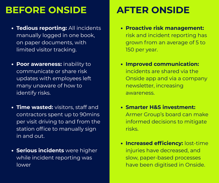 After four years of using Onside, serious accident rates at Armer Farms have dropped significantly, while incident and risk reporting rates have soared from just a handful to over 150 annually. With the ability to quickly log risks, incidents, or near-misses straight from their mobile devices, staff and contractors can alert each other - and leadership - in real-time.
